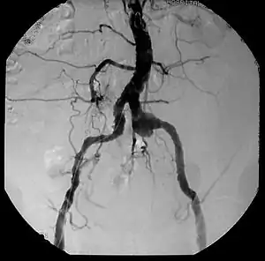 Syphilitic aortitis is inflammation of the aorta associated with the tertiary stage of syphilis infection. SA begins as inflammation of the outermost layer of the blood vessel, including the blood vessels that supply the aorta itself with blood, the vasa vasorum.[3] As SA worsens, the vasa vasorum undergo hyperplastic thickening of their walls thereby restricting blood flow and causing ischemia of the outer two-thirds of the aortic wall. Starved for oxygen and nutrients, elastic fibers become patchy and smooth muscle cells die. If the disease progresses, syphilitic aortitis leads to an aortic aneurysm. Overall, tertiary syphilis is a rare cause of aortic aneurysms.[3] Syphilitic aortitis has become rare in the developed world with the advent of penicillin treatments after World War II.