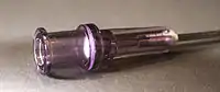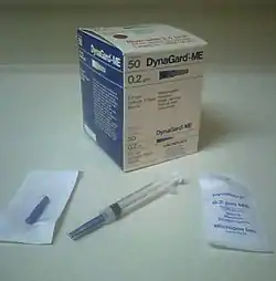 A syringe filter (sometimes called a wheel filter if it has a wheel-like shape) is a single-use filter cartridge. It is attached to the end of a syringe for use. Syringe filters may have Luer lock fittings, though not universally so. The use of a needle is optional; where desired it may be fitted to the end of the syringe filter.