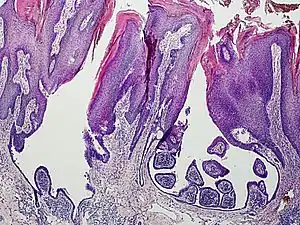 2. Monticciolo NL, Schmidt JD, Morgan MB (2002). "Verrucous carcinoma arising within syringocystadenoma papilliferum". Ann. Clin. Lab. Sci. 32 (4): 434–7. PMID 12458900.