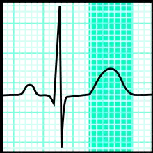 In electrocardiography, the T wave represents the repolarization of the ventricles. The interval from the beginning of the QRS complex to the apex of the T wave is referred to as the absolute refractory period. The last half of the T wave is referred to as the relative refractory period or vulnerable period. The T wave contains more information than the QT interval. The T wave can be described by its symmetry, skewness, slope of ascending and descending limbs, amplitude and subintervals like the Tpeak–Tend interval.[1]