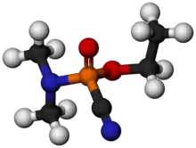 Tabun or GA is an extremely toxic synthetic organophosphorus compound.[1] It is a clear, colorless, and tasteless liquid with a faint fruity odor.[2] It is classified as a nerve agent because it fatally interferes with normal functioning of the mammalian nervous system. Its production is strictly controlled and stockpiling outlawed by the Chemical Weapons Convention of 1993. Tabun is the first of the G-series nerve agents along with GB (sarin), GD (soman) and GF (cyclosarin).