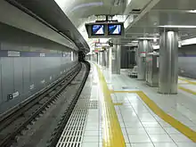 Tactile pavings installed on a platform at a Japanese train station. Horizontal tactile paving at the bottom indicates the 'inner' side, away from the rail tracks.