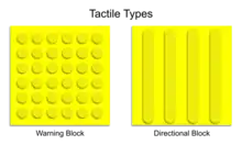Tactile paving (also called tenji blocks, truncated domes, detectable warnings, tactile tiles, tactile ground surface indicators, tactile walking surface indicators, or detectable warning surfaces) is a system of textured ground surface indicators found at roadsides (such as at curb cuts), by and on stairs, and on railway station platforms, to assist pedestrians who are vision impaired.