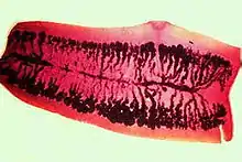 Taenia saginata proglottid stained to show uterine branches: The pore on the side identifies it as a cyclophyllid cestode.