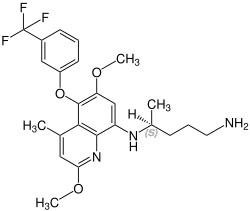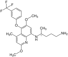 Tafenoquine, sold under the brand name Krintafel among others, is a medication used to prevent and to treat malaria.[3] With respect to acute malaria, it is used together with other medications to prevent relapse by Plasmodium vivax.[3] It may be used to prevent all types of malaria.[3] It is taken by mouth.[4]