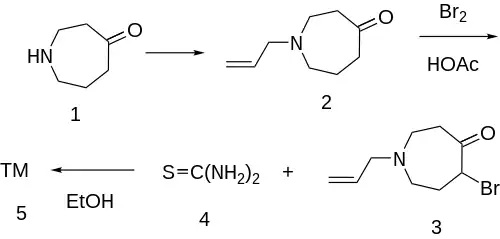 The N-alkylation of azepan-4-one [105416-56-6] (1) with allyl bromide in the presence of potassium carbonate gives 1-allyl-azepan-4-one (2). This is halogenated with molecular bromine in acetic acid to give 1-allyl-5-bromohexahydro-4-azepinone (3). The last step involves cyclization with thiourea (4) in refluxing ethanol, completing the synthesis of talipexole (5).