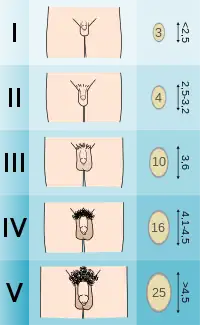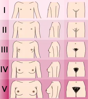 The Tanner scale (also known as the Tanner stages or sexual maturity rating (SMR)) is a scale of physical development as children transition into adolescence and then adulthood. The scale defines physical measurements of development based on external primary and secondary sex characteristics, such as the size of the breasts, genitals, testicular volume, and growth of pubic hair. This scale was first quantified in 1969 by James Tanner, a British pediatrician, after a two-decade-long study following the physical changes in girls undergoing puberty.[1][2][3][4]