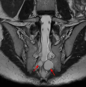 Tarlov cysts are relatively uncommon when compared to other neurological cysts. Initially, Isadore Tarlov believed them to be asymptomatic, however as his research progressed, Tarlov found them to be symptomatic in a number of patients. These cysts are often detected incidentally during MRI or CT scans for other medical conditions. They are also observed using magnetic resonance neurography with communicating subarachnoid cysts of the spinal meninges. Cysts with diameters of 1 cm or larger are more likely to be symptomatic; although cysts of any size may be symptomatic dependent on location and etiology. Some 40% of patients with symptomatic Tarlov cysts can associate a history of trauma or childbirth.[4] Current treatment options include CSF aspiration, fibrin-glue therapy, laminectomy with wrapping of the cyst, among other surgical treatment approaches. Interventional treatment of Tarlov cysts is the only means by which symptoms might permanently be resolved due to the fact that the cysts often refill after aspiration. Tarlov cysts often enlarge over time, especially if the sac has a check valve type opening. They are differentiated from other meningeal and arachnoid cysts because they are innervated and diagnosis can in cases be demonstrated with subarachnoid communication.