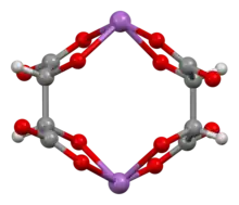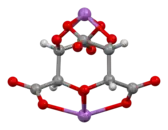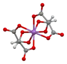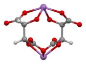Antimony potassium tartrate has been the subject of several X-ray crystallography studies.[21][22][23][24][25][2] The core complex is an anionic dimer of antimony tartrate (Sb2(C4H2O6)22-) which is arranged in a large ring with the carbonyl groups pointing outwards. The complex has D2 molecular symmetry with two Sb(III) centers bonded in distorted square pyramids. Water and potassium ions are held within the unit cell but are not tightly bound to the dimer. The anion is a well-used resolving agent.[26]