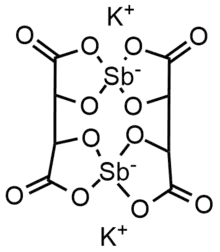 Antimony potassium tartrate, also known as potassium antimonyl tartrate, potassium antimontarterate, or tartar emetic,[3] has the formula K2Sb2(C4H2O6)2. The compound has long been known as a powerful emetic, and was used in the treatment of schistosomiasis and leishmaniasis. It is used as a resolving agent. It typically is obtained as a hydrate.