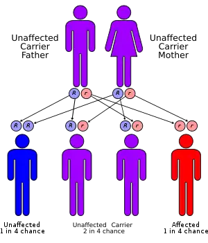 Tay–Sachs disease is an autosomal recessive genetic disorder, meaning that when both parents are carriers, there is a 25% risk of giving birth to an affected child with each pregnancy. The affected child would have received a mutated copy of the gene from each parent.[8] If a child received a normal copy from one parent and a mutated copy from the other, it is a carrier.