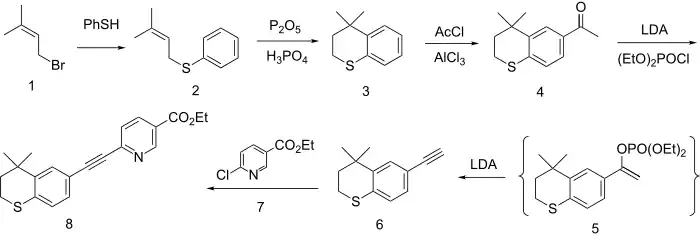 The formation of the ring system involves first alkylation of the anion from thiophenol with dimethylallyl bromide (1) to give the thioether (2). Friedel-Crafts cyclization of the olefin with the equivalent of PPA then gives the thiopyran (3). Acylation with acetyl chloride in the presence of aluminium chloride gives the methyl ketone (4). Reaction of the enolate of that ketone with diethyl chlorophosphate gives the enol phosphate 5 as a transient intermediate. This eliminates diethyl phosphite in the presence of excess base to give the corresponding acetylene 6. The anion from the reaction of the acetylene with base is then used to displace chlorine from Ethyl 6-chloronicotinate (7). This reaction affords the coupling product tazarotene (8).