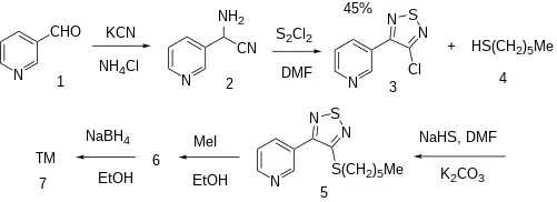 Ex 1: A Strecker type alpha-amino nitrile between nicotinaldehyde, potassium cyanide and ammonium chloride gives amino(pyridin-3-yl)acetonitrile [131988-63-1] (2). The halogenation of this intermediate with sulfur monochloride [10025-67-9] in DMF led to 3-chloro-4-(3-pyridyl)-1,2,5-thiadiazole [131986-28-2] (3).