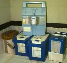A technetium-99m generator, or colloquially a technetium cow or moly cow, is a device used to extract the metastable isotope 99mTc of technetium from a decaying sample of molybdenum-99. 99Mo has a half-life of 66 hours[1] and can be easily transported over long distances to hospitals where its decay product technetium-99m (with a half-life of only 6 hours, inconvenient for transport) is extracted and used for a variety of nuclear medicine diagnostic procedures, where its short half-life is very useful.