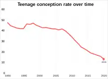The Labour government elected in 1997 pledged to halve the number of conceptions to girls under 18 by 2010, but by 2008 the drop was only 13%, a level the Secretary of State for Children Ed Balls called 'disappointing',[8] dropping by 9.5% from 2009 to 2010 despite an overall increase in fertility.[9] By 2014, the under-18 conception rate in England had dropped to 22.9 per 1,000, approximately half the 1997 figure of 45.9.[10]