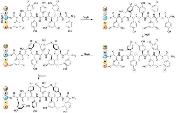 Once the heptapeptide backbone has been formed, the linear enzyme-bound intermediate is cyclized.[13] Gene disruption studies indicate cytochrome P450 oxygenases as the enzymes that performs the coupling reactions. The X-domain in the final NRPS module is required to recruit the oxygenase enzymes.[15] OxyB forms the first ring by coupling residues 4 and 6, and OxyE then couples residues 1 and 3. OxyA couples residues 2 and 4, followed by the formation of a C-C bond between residues 5 and 7 by OxyC.[16] The regioselectivity and atropisomer selectivity of these probable one-electron coupling reactions has been suggested to be due to the folding and orientation requirements of the partially crossed-linked substrates in the enzyme active site.[13] The coupling reactions are shown below.