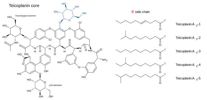 Teicoplanin (TARGOCID, marketed by Sanofi Aventis Ltd) is actually a mixture of several compounds, five major (named teicoplanin A2-1 through A2-5) and four minor (named teicoplanin RS-1 through RS-4).[8] All teicoplanins share a same glycopeptide core, termed teicoplanin A3-1 — a fused ring structure to which two carbohydrates (mannose and N-acetylglucosamine) are attached. The major and minor components also contain a third carbohydrate moiety — β-D-glucosamine — and differ only by the length and conformation of a side-chain attached to it.
