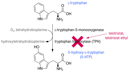 Telotristat is an inhibitor of tryptophan hydroxylase,[7] which mediates the rate-limiting step in serotonin biosynthesis.[2]