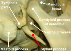 The temporal styloid process is a slender bony process of the temporal bone extending downward and forward from the undersurface of the temporal bone[1] just below the ear. The styloid process gives attachments to several muscles, and ligaments.