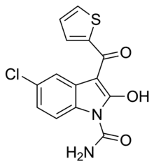 Tenidap was a COX/5-LOX inhibitor and cytokine-modulating anti-inflammatory drug candidate[1] that was under development by Pfizer as a promising potential treatment for rheumatoid arthritis,[2] but Pfizer halted development after marketing approval was rejected by the FDA in 1996[3] due to liver and kidney toxicity, which was attributed to metabolites of the drug with a thiophene moiety that caused oxidative damage.[4]