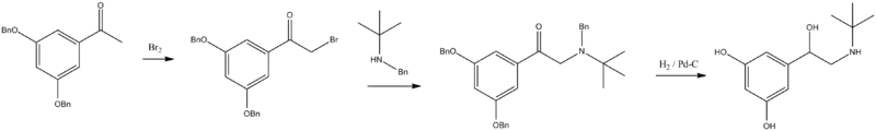 Terbutaline is synthesized by brominating 3,5-dibenzyloxyacetophenone into 3,5-dibenzyloxybromoacetophenone, which is reacted with N-benzyl-N-tert-butylamine, giving a ketone intermediate. Reduction of this product with H₂ over Pd/C leads to terbutaline.[12][13][14]