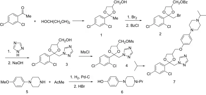 Terconazole synthesis synologous with ketoconazole except for the fact that triazole and not imidazole heterocyclic ring is used, and that isopropyl group instead of acetamide.