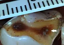 Wear on the surface of a tooth can lead to the exposure of the underlying dentine. When wear is severe tertiary dentine may form to help protect the pulp chamber.[4] Frequency of tertiary dentin in different species of primate suggests teeth 'heal' at different rates in different species.[5] Gorillas have a high rate of tertiary dentin formation, with over 90% of worn teeth showing tertiary dentine.[5] Hominins have a much lower rate of tertiary dentin formation, with around 15% of teeth that have dentin exposed through wear showing tertiary dentin formation.[5] Chimpanzees have rates in between gorillas and humans, with 47% of worn teeth showing ‘healing’.