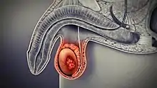 Testicular cancer is cancer that develops in the testicles, a part of the male reproductive system.[2] Symptoms may include a lump in the testicle or swelling or pain in the scrotum.[2] Treatment may result in infertility.[2]