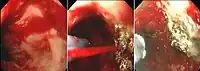 Argon plasma coagulation (APC) has been used to provide tissue coagulation and haemostasis since the early part of the 1990s.[7] A stream of argon gas is passed through an endoscopic catheter; this is then ionized at the tip of the catheter by an electric current. The tip of the catheter is held close to the tissue to be treated, and the current arcs across to the tissue causing a superficial (2–3 mm) burn. The lack of contact between the catheter and the tissue stops the tendency of the catheter to stick to the tissue, reducing unwanted tissue damage.[8]