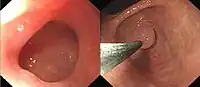 Injection sclerotherapy has been used to treat oesophageal varices since the 1960s.[4] A sheathed needle is passed through a channel in the endoscope, unsheathed and pushed into a varix. A sclerosing agent, such as ethanolamine or absolute alcohol, is then injected into the varix to cause scarring and constriction of the varix with the aim of obliterating the varix (or varices). This technique has now largely been superseded by variceal band ligation.