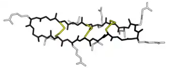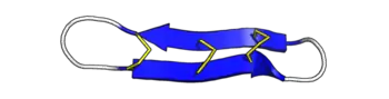 θ-defensins are cyclic peptides of 18 amino acids (~2 kDa), possessing antimicrobial activity against a range of Gram-positive and Gram-negative bacteria, fungi, and some retroviruses.[4][5][6][7] They consist of a pair of antiparallel β-sheets linked by three disulfide bonds arranged as a ladder along the sheets to form an extremely stable structure. Additionally, the peptides may self-associate into trimers.[8]