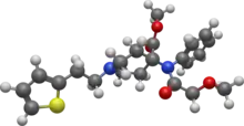 Thiafentanil (A-3080, Thianil) is a highly potent opioid analgesic that is an analog of fentanyl, and was invented in 1986.[1] Its analgesic potency is slightly less than that of carfentanil (itself approximately 10,000 times the potency of morphine, or 4,000 times that of heroin),[2] though with a faster onset of effects, shorter duration of action and a slightly lesser tendency to produce respiratory depression. It is used in veterinary medicine to anesthetise animals such as impala, usually in combination with other anesthetics such as ketamine, xylazine or medetomidine to reduce the prevalence of side effects such as muscle rigidity.[3]