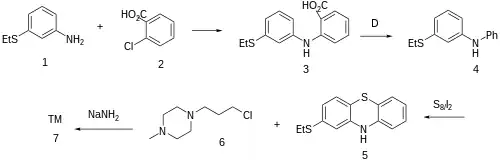 Goldberg reaction between 3-(ethylsulfanyl)aniline [1783-82-0] (1) and 2-chlorobenzoic acid [118-91-2] (2) to give the diarylamine, CID:82254530 (3). The carboxyl in the anthranilic acid residue, having performed its activating function, is then thermolytically removed to form [68083-49-8] (4). Upon treatment with sulfur and iodine, we get predominantly the phenothiazine [46815-10-5] (5); The rxn may well be aided by the presence of the electron donating thioether at the para-position. Alkylation with 1-(ɣ̞-chloropropyl)-4-methylpiperazine [104-16-5] (6) in the presence of sodamide affords Thiethylperazine (7).