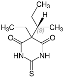 Thiobutabarbital contains a stereocenter and consists of two enantiomers. This is a racemate, ie a 1: 1 mixture of ( R ) - and the ( S ) - form:[2]