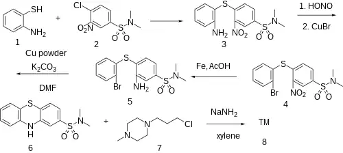 Thioether formation between 2-Aminothiophenol (1) and 4-Chloro-N,N-Dimethyl-3-Nitrobenzenesulfonamide [137-47-3] (2) gives 4-(2-aminophenyl)sulfanyl-N,N-dimethyl-3-nitrobenzenesulfonamide [5510-56-5] (3). Sandmeyer reaction with cuprous bromide [7787-70-4] gave 4-[(2-Bromophenyl)-thio]-N,N'-dimethyl-3-nitro-benzenesulfonamide [5510-58-7] (4). Bechamp reduction gave 3-Amino-4-((2-bromophenyl)thio)-N,N-dimethylbenzenesulphonamide [5592-64-3] (5). Goldberg reaction completed the formation of the phenothiazine ring and gave N,N-dimethyl-10H-phenothiazine-2-sulfonamide [1090-78-4] (6). Attachment of the sidechain by sodamide reaction with 1-(3-Chloropropyl)-4-Methylpiperazine [104-16-5] (7) completes the synthesis of Thioproperazine (8), respectively.