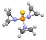 Thiotepa is an organophosphorus compound with the formula (C2H4N)3PS.[6] It is an analog of N,N′,N′′-triethylenephosphoramide (TEPA), which contains tetrahedral phosphorus and is structurally akin to phosphate. It is manufactured by heating aziridine with thiophosphoryl chloride.