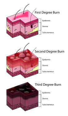 Burns that affect only the superficial skin layers are known as superficial or first-degree burns.[2][10] They appear red without blisters and pain typically lasts around three days.[2][10] When the injury extends into some of the underlying skin layer, it is a partial-thickness or second-degree burn.[2] Blisters are frequently present and they are often very painful.[2] Healing can require up to eight weeks and scarring may occur.[2] In a full-thickness or third-degree burn, the injury extends to all layers of the skin.[2] Often there is no pain and the burnt area is stiff.[2] Healing typically does not occur on its own.[2] A fourth-degree burn additionally involves injury to deeper tissues, such as muscle, tendons, or bone.[2] The burn is often black and frequently leads to loss of the burned part.[2][11]