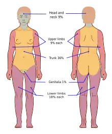 There are a number of methods to determine the TBSA, including the Wallace rule of nines, Lund and Browder chart, and estimations based on a person's palm size.[10] The rule of nines is easy to remember but only accurate in people over 16 years of age.[10] More accurate estimates can be made using Lund and Browder charts, which take into account the different proportions of body parts in adults and children.[10] The size of a person's handprint (including the palm and fingers) is approximately 1% of their TBSA.[10]