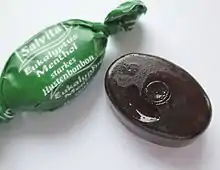 A throat lozenge (also known as a cough drop, sore throat sweet, troche, cachou, pastille or cough sweet) is a small, typically medicated tablet intended to be dissolved slowly in the mouth to temporarily stop coughs, lubricate, and soothe irritated tissues of the throat (usually due to a sore throat or strep throat), possibly from the common cold or influenza. Cough tablets have taken the name lozenge, based on their original shape, a diamond.