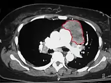 CT scan of the chest revealing a large necrotic mass in the left anterior mediastinum (indicated by the red line). Histology later established the diagnosis of a thymoma.