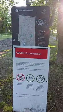 May 3 — As Montrealers experienced their second day of +20 °C (68 °F) weather of the year and began crowding into parks,[64] the city announced the closure of the parking lots at La Fontaine Park, Maisonneuve Park, Jarry Park, Frédéric-Back Park, and the Île de la Visitation nature park, effective May 3, 2020.[65][66]