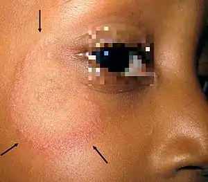 Tinea faciei is a fungal infection of the skin of the face.[1] It generally appears as a photosensitive painless red rash with small bumps and a raised edge appearing to grow outwards, usually over eyebrows or one side of the face.[1] It may feel wet or have some crusting, and overlying hairs may fall out easily.[2] There may be a mild itch.[3]