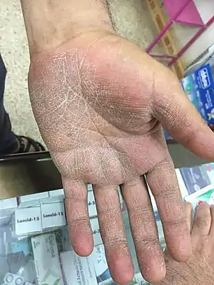 SymptomsDiffuse scaling, itch and prominent creases on palms[2]