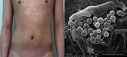 Pityriasis versicolor in a man and electron micrograph of his skin showing round Malassezia spores (S)[8]