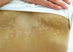 Tinea versicolor (also pityriasis versicolor) is a condition characterized by a skin eruption on the trunk and proximal extremities.[1] The majority of tinea versicolor is caused by the fungus Malassezia globosa, although Malassezia furfur is responsible for a small number of cases.[2][3] These yeasts are normally found on the human skin and become troublesome only under certain circumstances, such as a warm and humid environment, although the exact conditions that cause initiation of the disease process are poorly understood.[2][4]