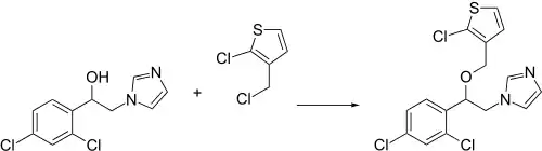 A displacement reaction between 1-(2,4-dichlorophenyl)-2-(1H-imidazol-1-yl)ethanol and 2-chloro-3-(chloromethyl)thiophene is performed.
