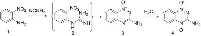 The first step in the synthesis, condensation of 2-nitroaniline (1) with cyanamide, probably involves initial formation of a guanidine such as 2. This then cyclizes to the heterocycle 3. Oxidation with hydrogen peroxide then completes the preparation of tirapazamine (4).
