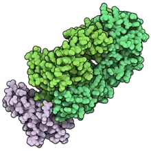![]() Fab fragment of tislelizumab (green) binding the extracellular domain of PD-1 (pale pink). From PDB entry 7BXA | |