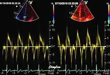 Like Doppler flow, tissue Doppler can be acquired both by spectral analysis (spectral density estimation) as pulsed Doppler[1] and by the autocorrelation technique as colour tissue Doppler[2] (duplex ultrasonography). While pulsed Doppler only acquires the velocity at one point at a time, colour Doppler can acquire simultaneous pixel velocity values across the whole imaging field. Pulsed Doppler on the other hand, is more robust against noise, as peak values are measured on top of the spectrum, and are unaffected of the presence of clutter (stationary reverberation noise).