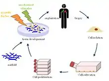 Various biomaterials, whether they are biological, synthetic, or a combination of both, can be used to create scaffolds, which when implanted in a human body can promote host tissue regeneration.[5] First, cells from the patient in which the scaffold will be implanted in are harvested. These cells are expanded and seeded into the created scaffold, which is then inserted inside the human body.[6] The human body serves as a bioreactor, which allows the formation of an extracellular matrix (ECM) along with fibrous proteins around the scaffold to provide the necessary environment for the heart and circulatory system.[7] The initial implantation of the foreign scaffold triggers various signaling pathways guided by the foreign body response for cell recruitment from neighboring tissues.[2] The new nanofiber network surrounding the scaffold mimics the native ECM of the host body.[8] Once cells begin to populate the cell, the scaffold is designed to gradually degrade, leaving behind a constructed heart valve made of the host body's own cells that is fully capable of cell repopulation and withstanding environmental changes within the body.[9] The scaffold designed for tissue engineering is one of the most crucial components because it guides tissue construction, viability, and functionality long after implantation and degradation.